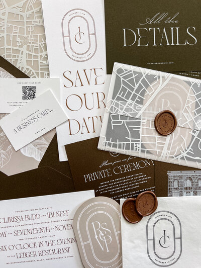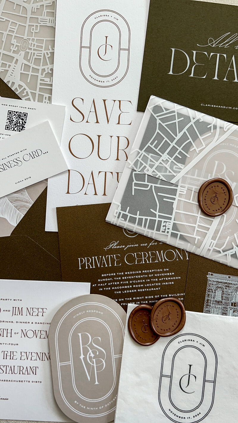 Save the Dates, Wedding Website, Invitation Suite, Signage, Menus, Escort Display