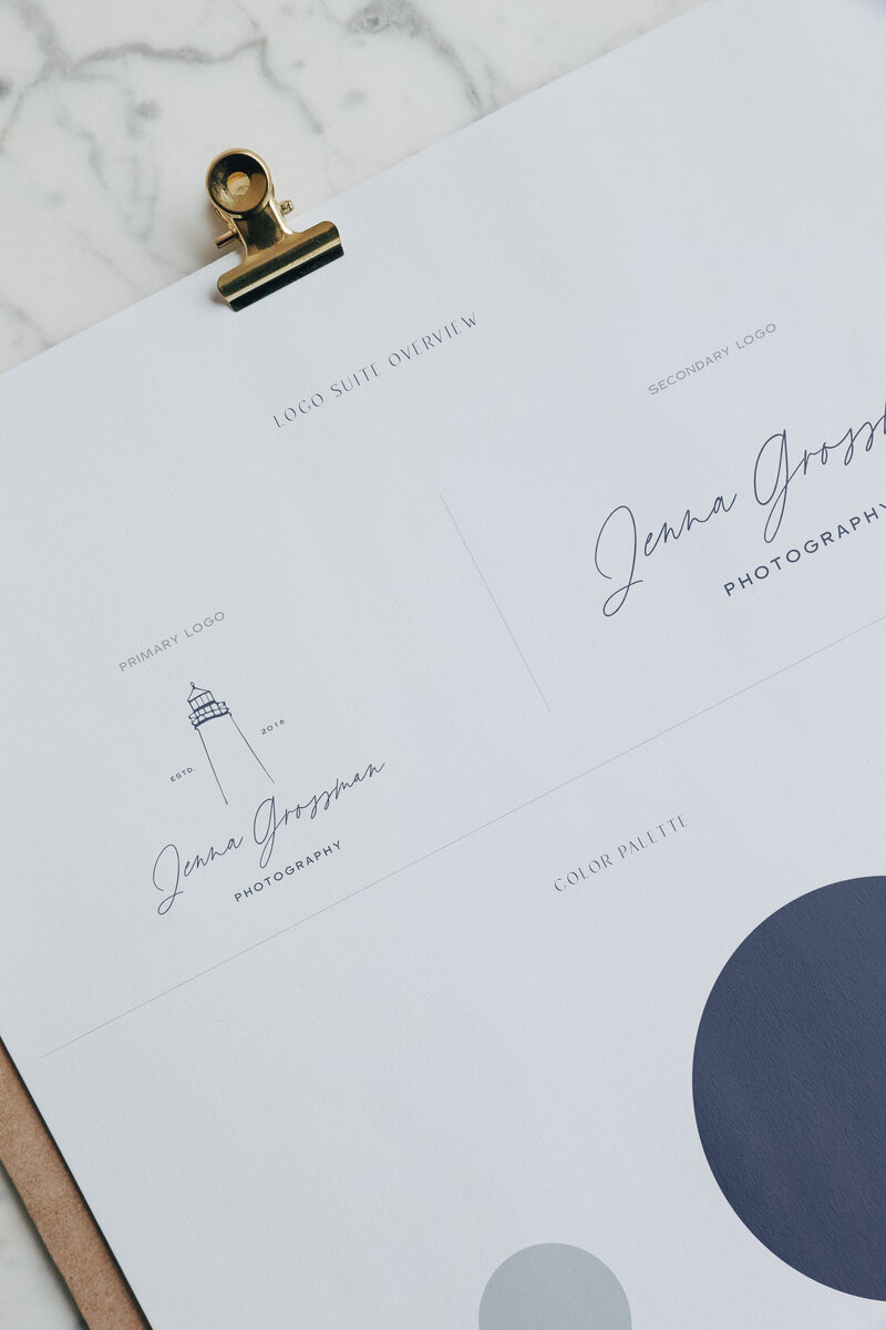 Jenna Grossman Photography specializes in capturing the beauty of landscapes, with a particular emphasis on lighthouses, symbolizing guidance and serenity. Recently, Jenna has expanded her portfolio to include portrait photography, capturing families, couples, and micro weddings with a natural and timeless aesthetic. The brand design reflects Jenna's artistic vision and versatility. The primary logo centers on a hand-drawn lighthouse illustration, symbolizing her passion for coastal landscapes. It is paired with elegant script typography, representing her personal, heartfelt approach to photography, and balanced by modern sans-serif text for a clean, professional feel.