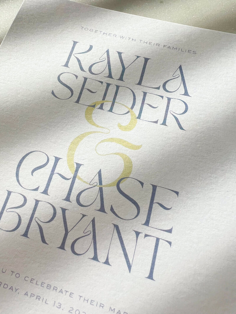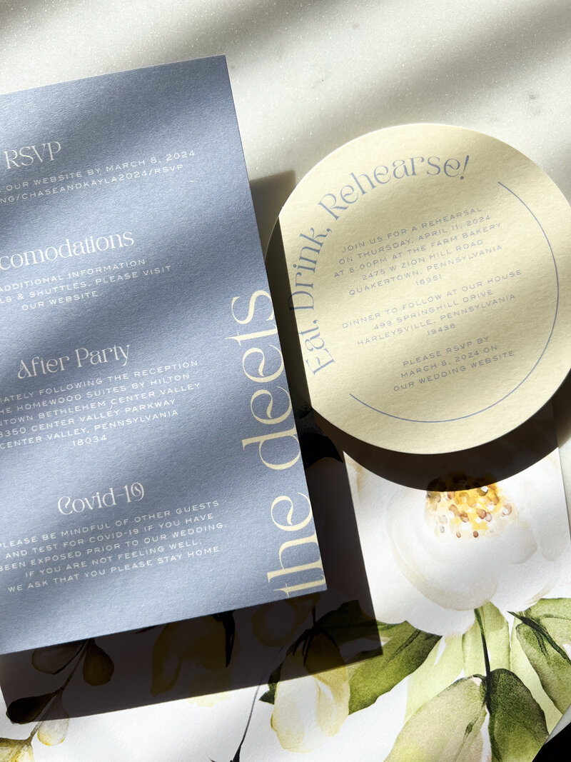 Kayla and Chase had one goal in mind when planning their wedding - they wanted it to be FUN. For them, that meant a high-energy band, an ample amount of food trucks, welcome margs, and fun, Spring-inspired paper goods and signage. We designed a blue and yellow suite complete with their invitation, details card, and rehearsal card with a floral liner which matched their welcome sign, seating chart, and menus.