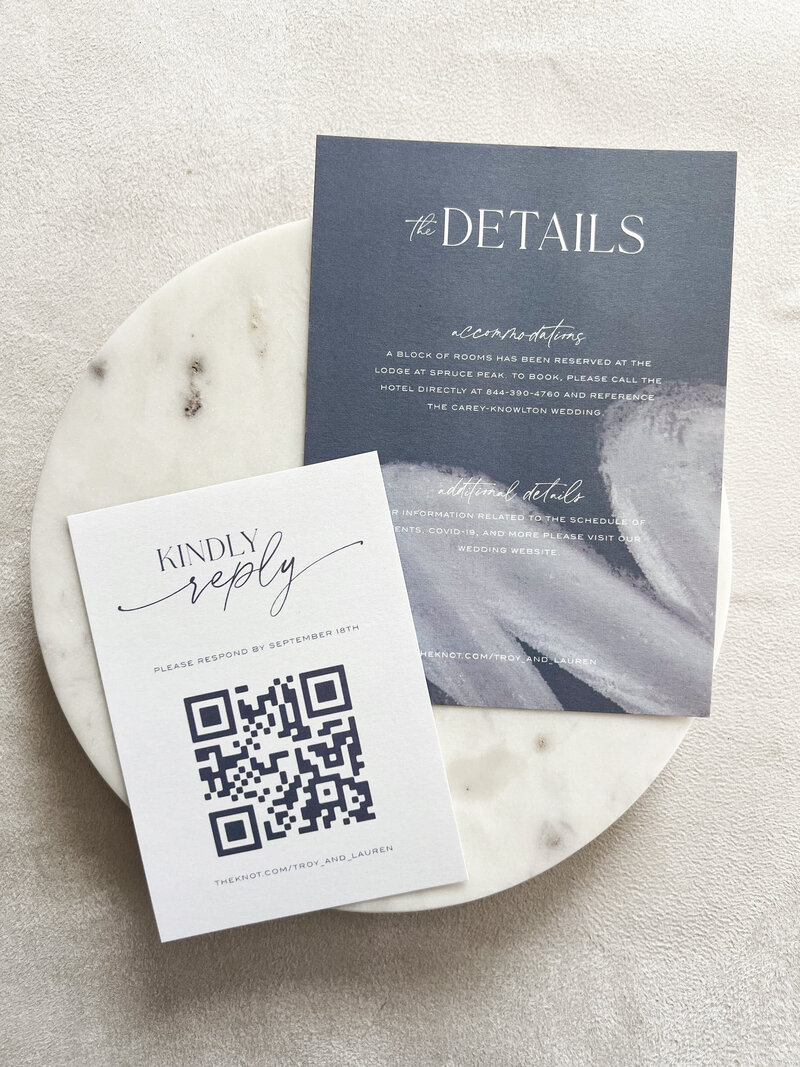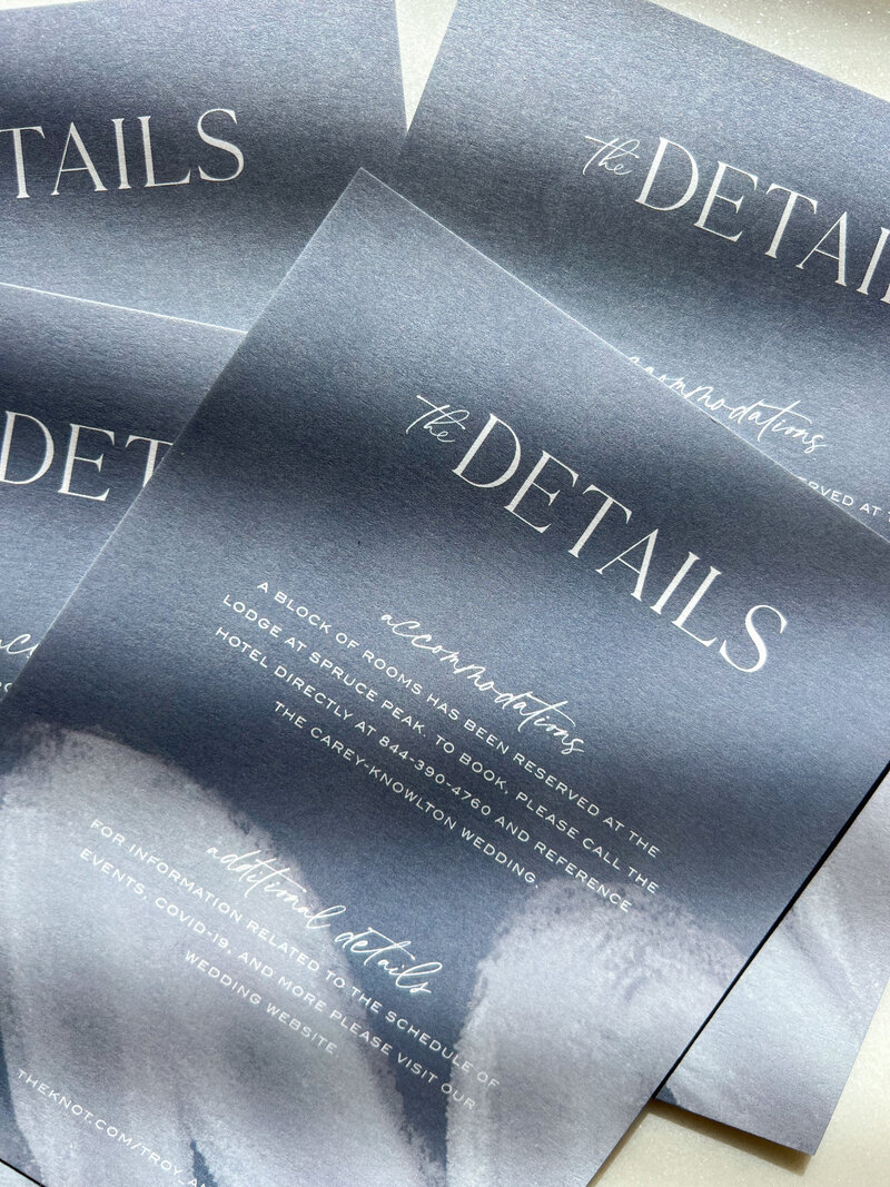 Lauren and Troy's wedding vision was a juxtaposition of an elevated, modern aesthetic meets the mountains of Vermont. They chose a dusty blue with a mix of burgundy and metallics and for their paper goods, we used modern typography and a brush stroke graphic throughout their branding and signage.